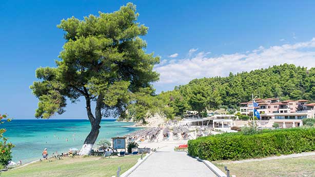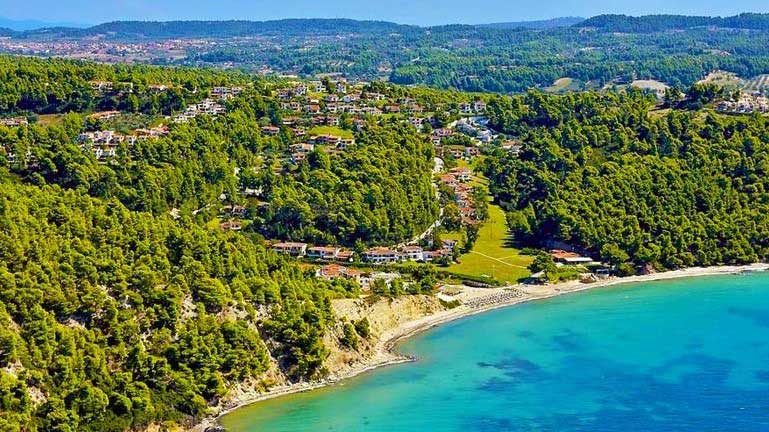 It is a beautiful pine-covered area with a bay that ends in the sea. Ideal for people looking for peace and relaxation on their vacation as the beach does not extend over 1,800 meters and the waters are shallow and calm. It is a relatively small settlement, but it has infrastructure (basketball court, tennis, playground) for the whole family.